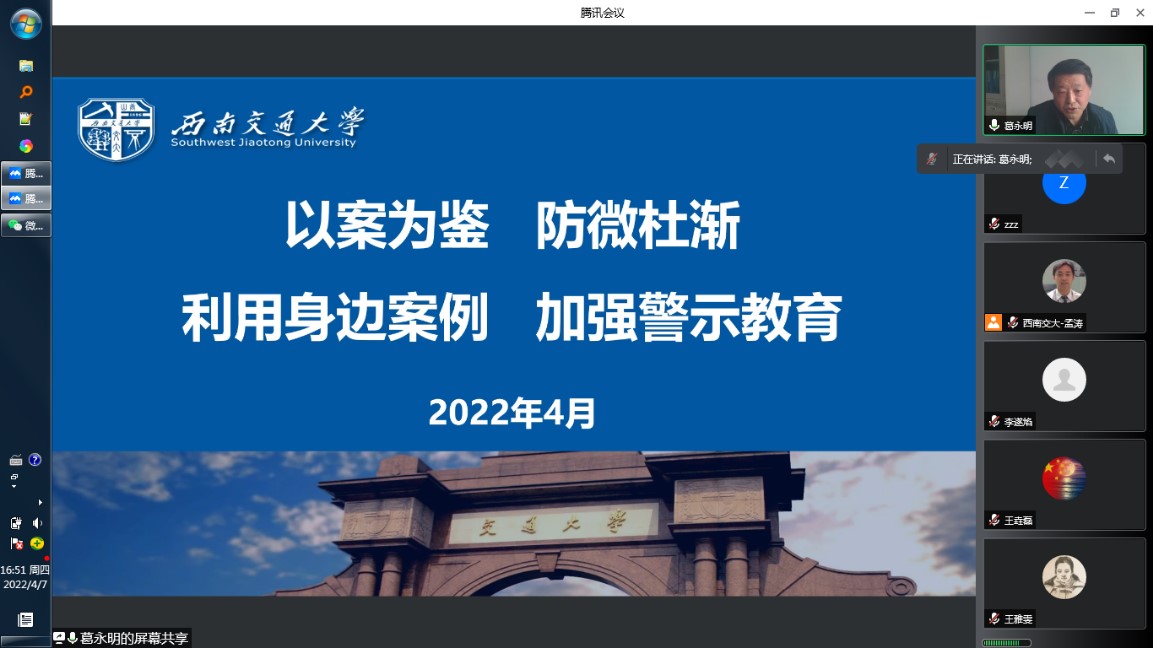 2022-04-112022年4月7日,新澳门六合彩资料 生物工程系教工党支部在线上开展师德师风警示教育活动,学院党委书记葛永明参加并开展了“以案为例,...