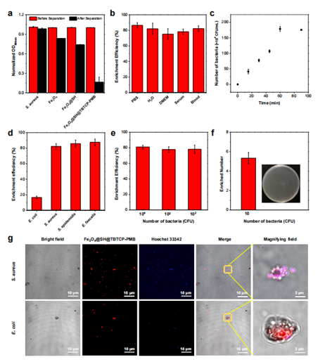 Fe3O4@SH@TBTCP-PMB在不同的环境中(缓冲溶液PBS,水,细胞培养基DMEM,血清和血液)对革兰氏阳性菌具有超强的捕获能力。在短短1小时内,即使在低细菌浓度下,也能以超过80%的富集效率捕获革兰阳性细菌。(图3)。