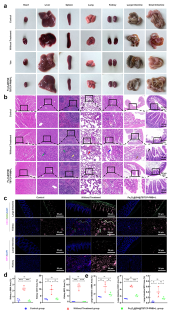 基于以上研究,该团队利用磁性纳米颗粒(NPs)独特的病原体富集与捕获能力,以及磁性分离特性,成功规避了与血液循环和代谢相关的问题,制备了一种聚集诱导发光光敏剂武装的磁性纳米颗粒,Fe3O4@SH@TBTCP-PMB,用于治疗败血症。磁性NPs和PDT的协同作用为败血症治疗提供了有效的解决方案,为进一步解决光敏药物或抗菌材料在败血症治疗过程中对耐药细菌捕获能力不足以及长期血液循环和代谢困难等问题提供理论指导。该工作以“Aggregation-Induced Emission Photosensitizer-Armored Magnetic Nanoparticles for Sepsis Treatment: Combating Multidrug-Resistant Bacteria and Alleviating Inflammation”为题发表在《Advanced Functional Materials》上。西南交通大学为本论文的通讯单位,文章第一作者是西南交通大学博士生王嘉莉,通讯作者是吴明雨和封顺教授。该研究得到国家自然科学基金委的支持(22177094,22174117)。