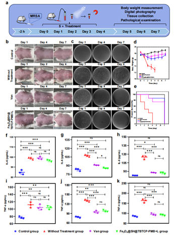 基于Fe3O4@SH@TBTCP-PMB在体外表现出的卓越细菌捕获、磁分离特性和优异的抗菌性能,进一步通过建立耐甲氧西林金黄色葡萄球菌(MRSA)感染的小鼠败血症模型来研究Fe3O4@SH@TBTCP-PMB的体内抗菌效果。研究表明,在白光照射下,Fe3O4@SH@TBTCP-PMB不仅具有优异的杀菌效果,而且可以通过调节细胞因子、降低粘附分子表达、调控氧化应激水平从而缓解炎症,有效治疗小鼠败血症,提高存活率(图5和图6)。