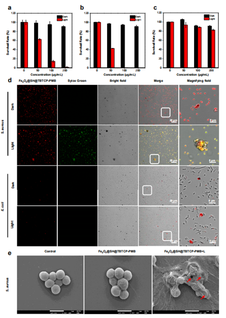 充分利用磁性纳米颗粒和AIE PS的独特属性,开发AIE PS武装的磁性纳米颗粒, Fe3O4@SH@TBTCP-PMB(图1)。这种创新的纳米复合物具有显著的超顺磁性,高效产生ROS的能力,和带正电的特性(图2),阳离子光敏剂增强了磁性纳米材料通过静电相互作用捕获细菌的能力,磁分离的性能可以有效规避光敏剂通过血液循环导致的潜在毒性。