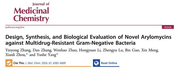 为第一单位,以“Design, Synthesis, and Biological Evaluation of Novel Arylomycins against Multidrug-Resistant Gram-Negative Bacteria”为题,发表在药物化学顶级期刊《Journal of Medicinal Chemistry》上,论文第一作者为周先礼教授指导的博士研究生张银勇,通讯作者为新澳门六合彩资料