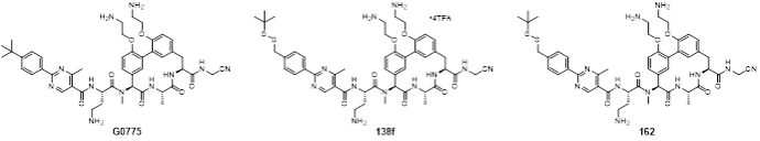针对以上情况,周先礼教授团队对G0775进行结构改造和优化,最终发现化合物138f(图1),对美罗培南耐药鲍曼不动杆菌和铜绿假单胞菌的MIC分别为0.125 μg/mL和4 μg/mL,比G0775增强8-16倍和4-8倍。在大鼠体内药代动力学研究中,静脉注射给药10 mg/kg,162(138f的游离碱,图1)的暴露量(AUC)和半衰期(T1/2)分别为141981 h·ng/mL和4.18 h,达到了G0775的2.3倍和2.8倍。在中性粒细胞减少的小鼠大腿感染模型中,感染菌株选择多药耐药铜绿假单胞菌,G0775不仅药效低下,剂量依赖性也缺失,而化合物162表现出显著优于G0775的体内药效,并且存在明显的剂量依赖性(图2)。分子对接结果显示(图3),162与LepB(大肠杆菌的SPase I)通过共价键结合,且空间取向和G0775基本相同,但具体结合模式有差异,这可能是162增强抗菌活性的原因。
