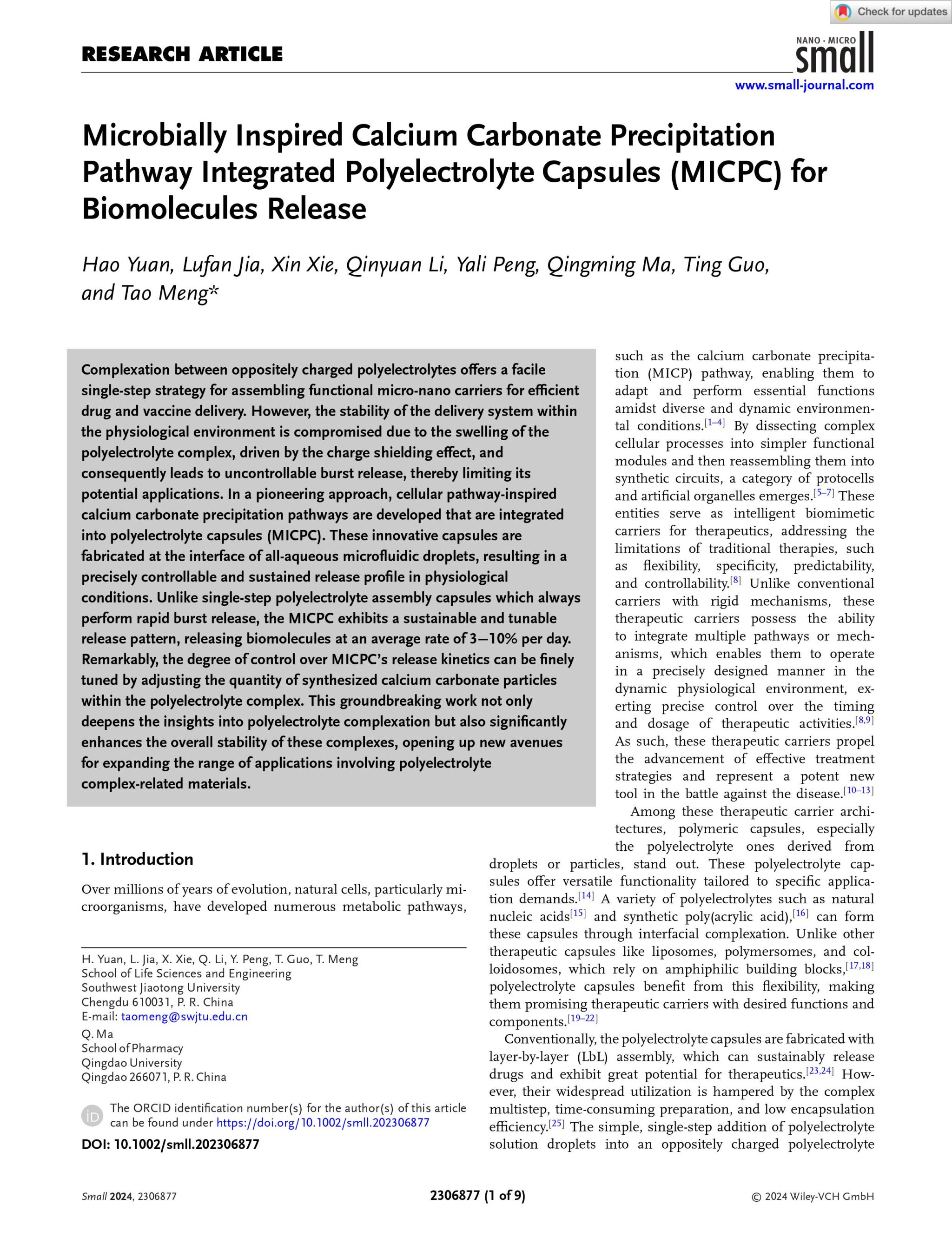 近日,国际微纳生物领域权威期刊《Small》(影响因子13.3)报道了我校“微纳生物技术”创新团队孟涛教授的研究成果“Microbially Inspired Calcium Carbonate Precipitation Pathway Integrated Polyelectrolyte Capsules (MICPC) for Biomolecules Release”中文译名:“受微生物启发的整合碳酸钙颗粒合成通路的聚电解质微囊(MICPC)用于缓释生物分子”(DOI: 10.1002/smll.202306877)。论文第一作者为新澳门六合彩资料