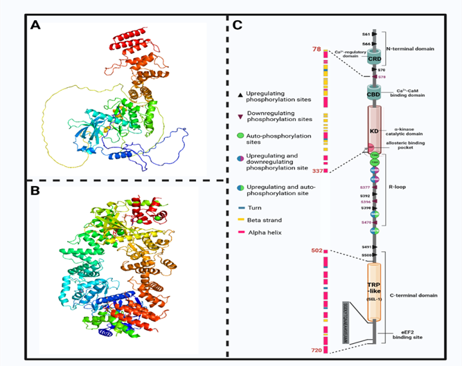 现有研究结果表明,eEF2K的催化结构域与传统真核生物蛋白激酶的催化结构域没有同源性。其特殊的催化结构域能识别底物α螺旋内的氨基酸并使之磷酸化,因此被定位为一个新的非典型α激酶超家族的成员。eEF2K由一个位于N端的非典型CaM 结合域(CTM)组成,通过一个调节元件(RE)和一个与 C端域(CTD)相连的长调节环(R-loop)与α激酶域(KD)相连。据预测,CTD 包含三个螺旋重复,编码底物eEF2的结合位点。eEF2K的催化结构域位于分子N端的 77-99个残基,CaM与eEF2K催化结构域的末端结合、eEF2K的残基 562-725包含两个 α-helical 重复序列,具有TPR 结构域及其 SEL1-ike 亚家族的特征。eEF2K的 SEL1 样结构域是底物磷酸化所必需的。N/D 环中高度保守的残基对酶的活性至关重要,R环包含多个磷酸化位点。