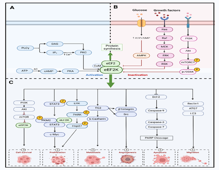 真核细胞延伸因子2激酶(eEF2K)是由钙/钙调素激活的α-激酶家族的成员。作为翻译的关键调节因子,eEF2K 可使 eEF2 在其成熟多肽的 Thr56 氨基酸残基上磷酸化,从而降低其对核糖体的亲和力,抑制蛋白质合成的延长。值得注意的是,eEF2K在恶性细胞中经常高度过表达。eEF2K 对肿瘤细胞的许多细胞过程至关重要,包括调节自噬活性和细胞 ATP 水平、血管生成、肿瘤细胞迁移、增殖、存活和上皮-间质转化(EMT)。因此,eEF2K 被认为是抗癌治疗的有效靶点。