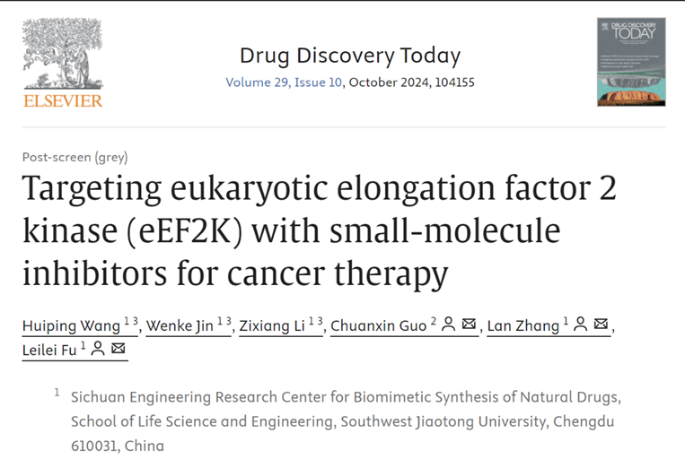 符雷蕾团队在美国药学权威期刊Drug Discovery Today上发表了一篇题为“Targeting eukaryotic elongation factor 2 kinase (eEF2K) with small-molecule inhibitors for cancer therapy”综述(//doi.org/10.1016/j.drudis.2024.104155. 影响因子:6.5)。这篇综述总结了eEF2K 的分子结构及其在癌症中的致癌作用,包括血管生成、肿瘤细胞迁移、增殖、存活和上皮-间质转化(EMT),同时进一步讨论了针对eEF2K的小分子化合物的现状,包括单靶点、双靶点小分子化合物以及新出现的联合治疗策略,以期为肿瘤治疗提供新思路。论文第一作者为新澳门六合彩资料