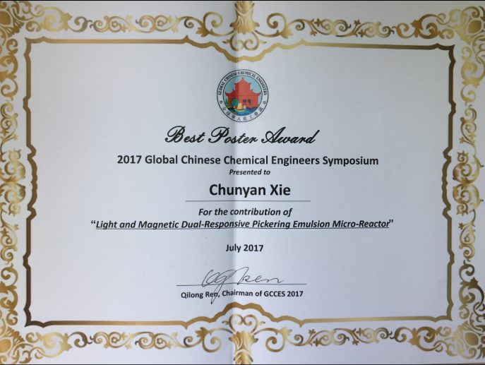 一等奖(1名):论文Light-Triggered Release from Pickering Emulsions Stabilized by TiO2 Nanoparticles with Tailored Wettability(白瑞雪、薛龙辉、豆荣昆、孟世昕、谢春燕、张青、孟涛*等,西南交通大学)(Langmuir,2016年32卷36期);