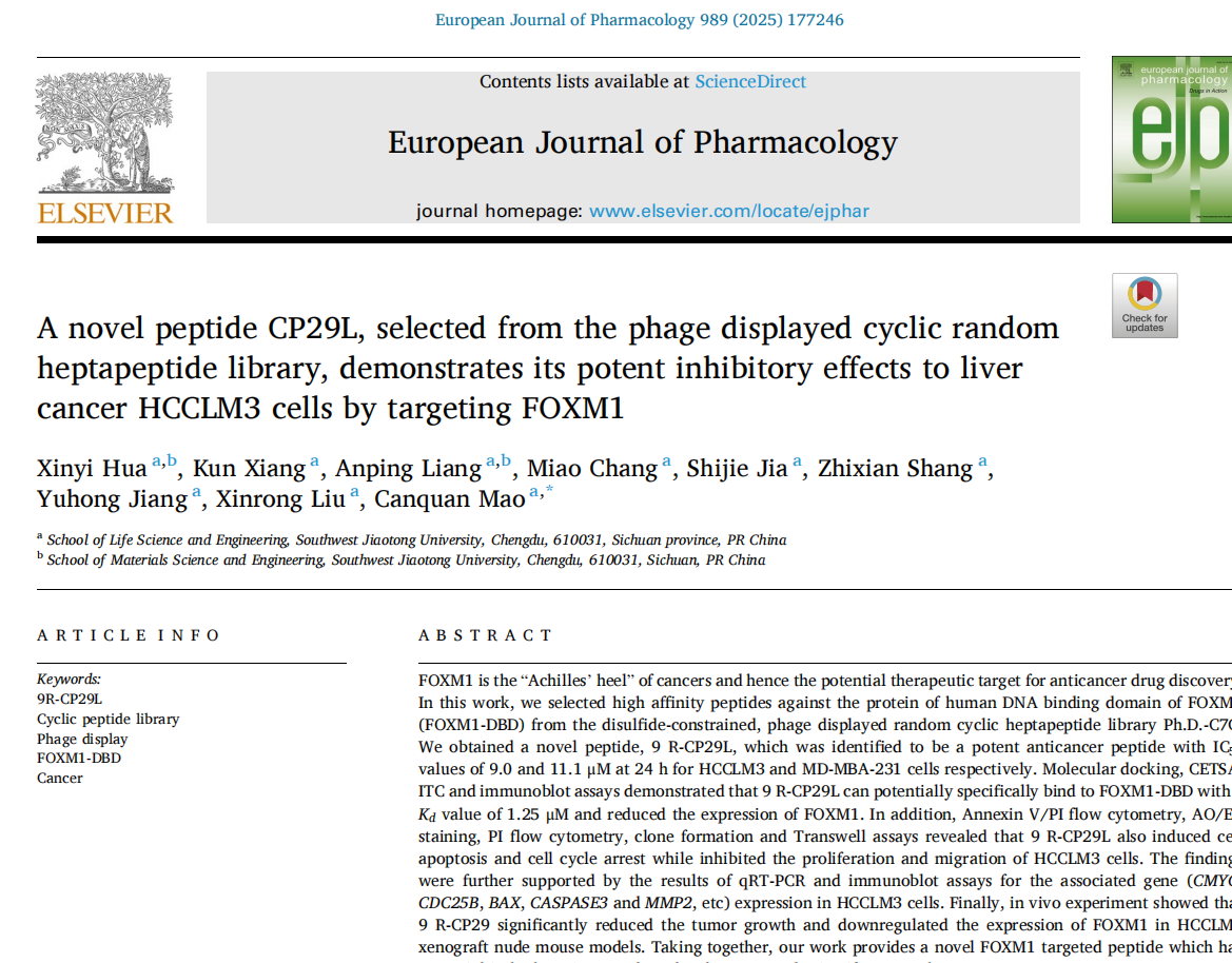 “分子靶向药物药理实验室” 题为“A novel peptide CP29L, selected from the phage displayed cyclic random heptapeptide library, demonstrates its potent inhibitory effects to liver cancer HCCLM3 cells by targeting FOXM1” 的研究成果。论文通讯作者为茆灿泉教授,2021级博士研究生花欣怡、2019级硕士研究生项坤为工作主要完成者,西南交通大学为唯一署名单位和通讯作者单位。