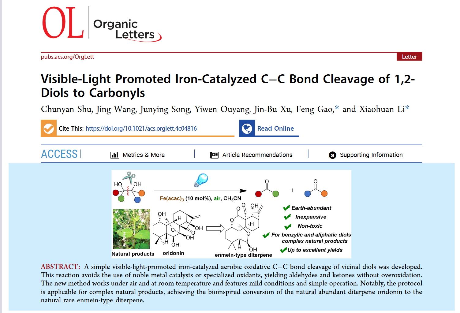 “活性天然产物成药性研究”实验室的最新研究成果“Visible-Light Promoted Iron-Catalyzed C–C Bond Cleavage of 1,2-Diols to Carbonyls”。2022级硕士研究生舒春艳为第一作者,高峰教授和李晓欢副教授为通讯作者,西南交通大学是唯一通讯单位。