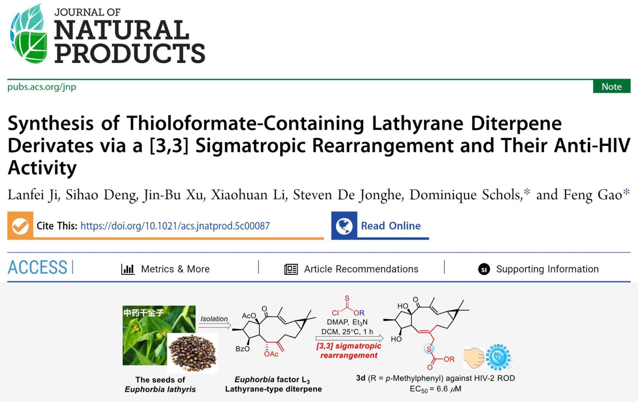 题为《Synthesis of Thioloformate-Containing Lathyrane Diterpene Derivates via a [3,3] Sigmatropic Rearrangement and Their Anti-HIV Activity》的论文,第一作者为2022级硕士研究生姬蓝飞,高峰教授和鲁汶大学Dominique Schols教授共为通讯作者,西南交通大学为第一通讯单位。另一篇研究成果题为《Palladium-Catalyzed Late-Stage Functionalization of Natural Antitumor Drug: Synthesis and Bioactivity of 5-Aryl Camptothecins》的论文第一作者为新澳门六合彩资料