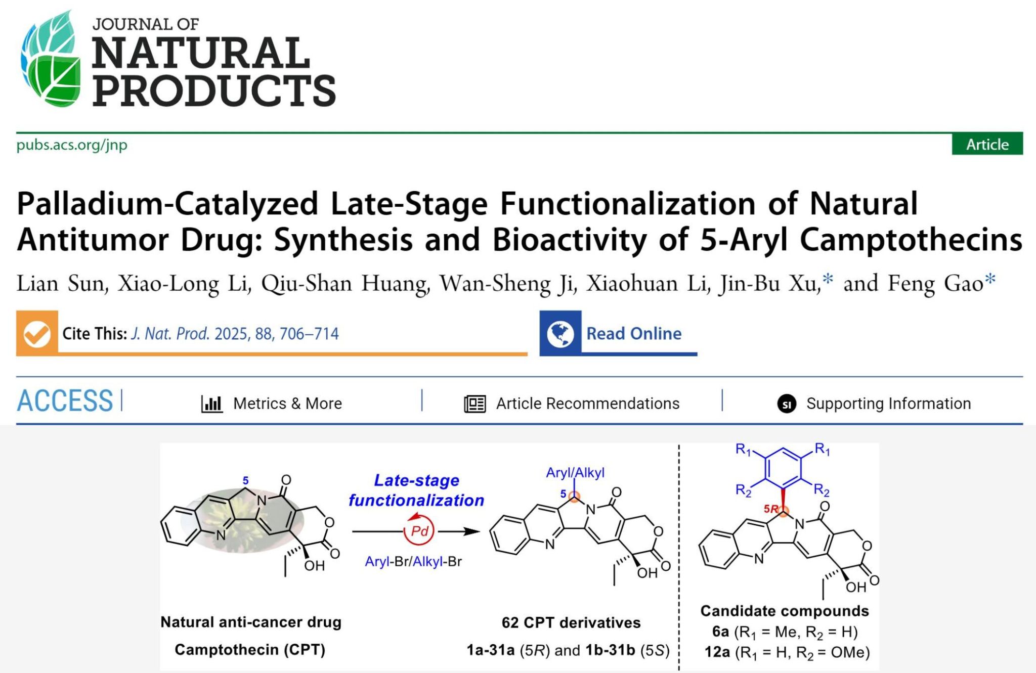 利用后期官能团化策略(Late-Stage Functionalization, LSF),以喜树碱为原料,通过过渡金属钯催化的C-H活化反应,一步构建C5芳基化衍生物,并合成了系列非对映异构衍生物。在后期的抗肿瘤活性筛选、机制研究及靶点验证中,发现大部分衍生物表现出与喜树碱相当或优于喜树碱的抗肿瘤活性,且R构型的衍生物活性明显优于S构型。本研究不仅发现并阐明了喜树碱C5位构型对活性的影响,且发现了活性优异的先导物供后续进一步研究,也为复杂药物分子的结构修饰提供了高效、简便的方法。