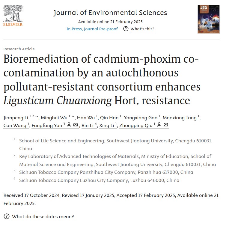 邱忠平教授团队在环境科学与生态学科学领域期刊Journal of Environmental Sciences(JCR Q1,IF=5.9)上发表了题为《Bioremediation of cadmium-phoxim co-contamination by an autochthonous pollutant-resistant consortium enhances Ligusticum Chuanxiong Hort. resistance》的研究文章。2023级博士研究生李建鹏与吴明蔧老师为共同第一作者,邱忠平教授为通讯作者,新澳门六合彩资料-新澳门六合彩开奖