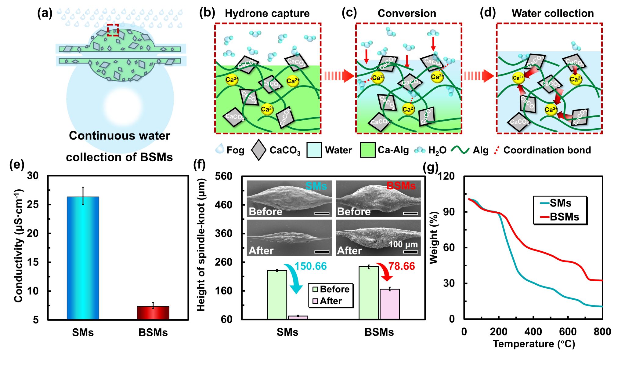 受蛛丝从自然雾气中集水的启发,亲水纺锤节超细纤维作为一种有价值的水收集工具以缓解淡水短缺。然而,目前最易获得的生物基人造蛛丝的耐用性和集水效率较低,由于水的反复浸泡造成形变,使其失去了持续集水的能力。在本研究中,我们开发一种利用酶介导原位仿生物矿化的微流控方法,构建具有粗糙纺锤节的海藻酸钙微纤维(BSMs),以增强生物基微纤维的集水效率和耐用性。在微纤维内策略性地空间定位负载酶,使矿化过程主要发生在纺锤节处,这使得纺锤节与连接纤维之间形成明显的表面粗糙度差异,从而提高水收集效率。此外,酶介导反应产生的CaCO3颗粒还牢固地锚定在纤维内部,在集水过程中补充流失的Ca2+,增强该微纤维的耐用性达到108次。