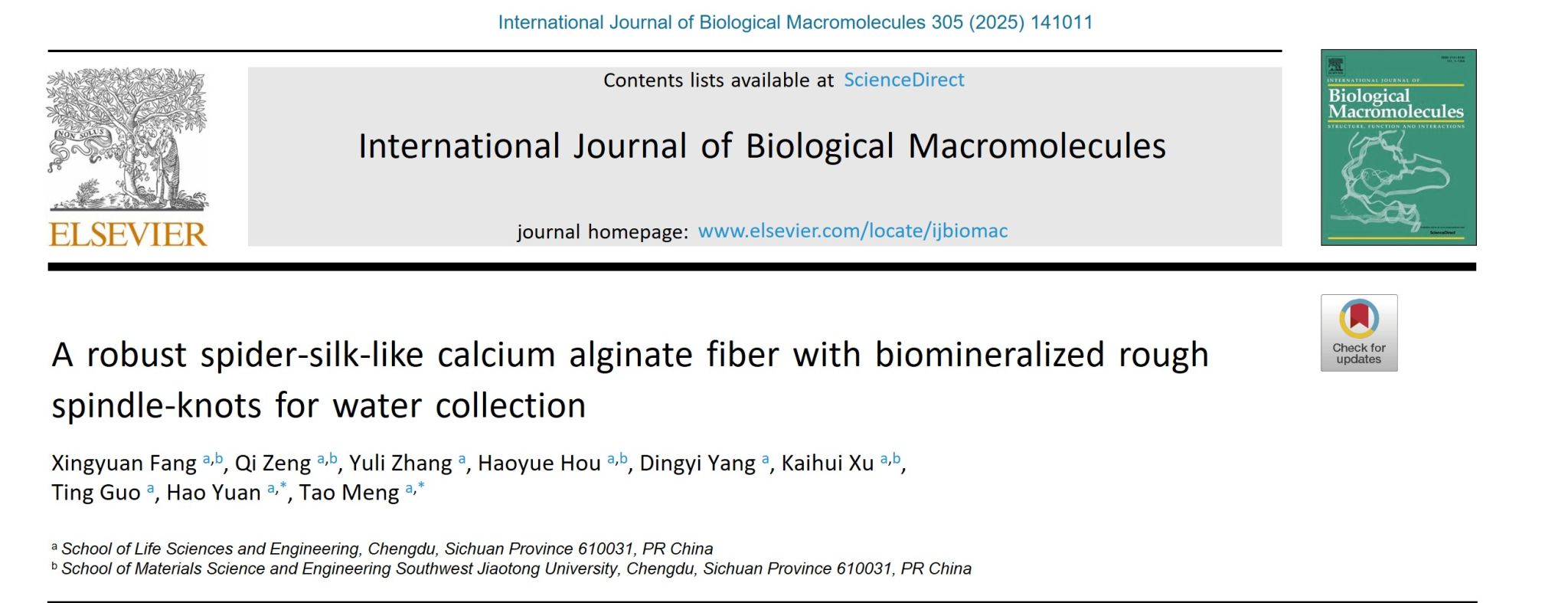 近期,生物学杂志《International Journal of Biological Macromolecules》(JCR,Q1区,2024影响因子8.5)报道了我校“微纳生物技术”创新团队的研究成果“A robust spider-silk-like calcium alginate fiber with biomineralized rough spindle-knots for water collection”。论文第一作者为新澳门六合彩资料