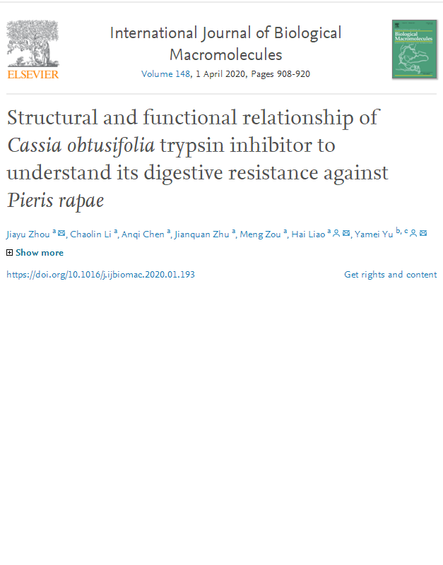 “药用植物资源与分子生物学实验室”在国际刊物International Journal of Biological Macromolecules(IF4.784,JCR一区)在线发表文章“Structural and functional relationship of Cassia obtusifolia trypsin inhibitor to understand its digestive resistance against Pieris rapae”。 该文在撰写过程中得到了清华大学隋森芳教授(西南交通大学双聘院士)与西南交通大学黄新河副教授的指点,特此表示感谢。