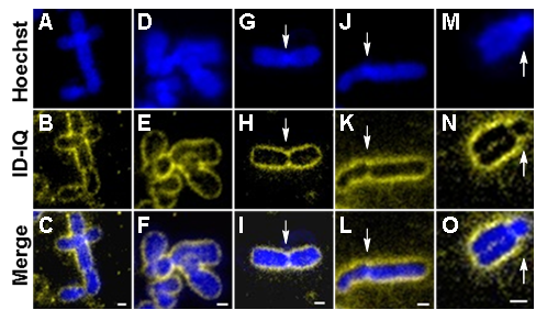 Fig 2. ID-IQ标记CP用于辅助染色体分析。(A-C) 有助于重叠的染色体的分离。(D-F) 有助于区分相邻的染色体。(G-O) 有助于快速而准确的辨别染色体形态及着丝粒位置,区分不同类型的染色体,包括中间着丝粒(G-I)、亚中间着丝粒(J-L)和近端着丝粒(M-O)染色体。图中箭头指示着丝粒的位置。