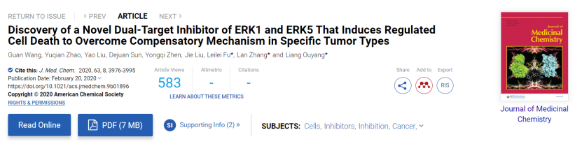 符雷蕾副教授、张岚副教授,联合四川大学生物治疗国家重点实验室欧阳亮教授提出了一种同时靶向ERK1和ERK5的治疗策略,并报道了首个ERK1/ERK5双靶点小分子抑制剂,为肿瘤治疗提供了一种新的治疗策略。