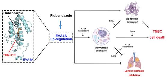 在本研究工作中,团队成员发现氟苯达唑能够诱导TNBC细胞发生自噬与凋亡,在体内外均表现出明显的抗增殖与抗转移活性。通过进一步研究发现,诱导自噬性细胞死亡是氟苯达唑抑制TNBC的关键,而阻断自噬将会降低氟苯达唑抗肿瘤效果。为了解析氟苯哒唑的潜在作用靶标,研究团队随后采用RNA测序技术(RNAseq)分析氟苯达唑处理的TNBC细胞基因表达谱的变化,同时结合免疫荧光、免疫组化、免疫蛋白印迹加以验证;通过基因敲除沉默EVA1A表达,发现氟苯达唑抗TNBC作用降低;当自噬相关基因ATG5受到抑制,氟苯达唑诱导自噬与抗增殖能力在EVA1A过表达的TNBC细胞中降低,揭示氟苯达唑通过靶向EVA1A调控自噬与凋亡而发挥抗TNBC作用。此外,研究人员采用同源建模确定了Thr113是参与氟苯达唑与EVA1A结合的潜在关键氨基酸残基。该项研究首次报道了氟苯达唑在TNBC中通过靶向EVA1A诱导自噬性细胞死亡,调控自噬与凋亡,发挥抗肿瘤作用。为探索氟苯达唑的抗癌作用提供新的见解,也为TNBC患者的个体化治疗提供了新的理论依据和治疗策略。