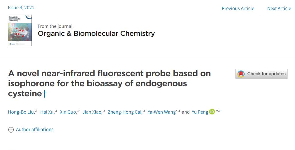 基于上述二氰基异佛尔酮骨架的研究,该课题组也在有机和生物化学领域重要期刊《Organic & Biomolecular Chemistry》 (影响因子:3.9) 上发表了题为“A novel near-infrared fluorescent probe based on isophorone for the bioassay of endogenous cysteine”的论文。新澳门六合彩资料