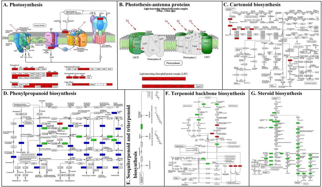 对9217个差异表达的单基因(DEGs)进行GO和KEGG富集分析结果表明,苯丙烷代谢(phenyl- propanoid biosynthesis)、MVA介导的萜类骨架生物合成(terpenoid backbone biosynthesis)和类固醇生物合成(steroid biosynthesis)等过程在鳞茎中富集,而MEP介导的萜类骨架生物合成、光合作用(photosynthesis)、光合作用-天线蛋白(photosynthesis-antenna protein)和类胡萝卜素生物合成(carotenoid biosynthesis)等过程在地上组织(叶、花、茎)中富集。聚类分析表明,与上游萜类骨架生物合成途径相比,下游类固醇生物合成途径在甾体生物碱的生物合成中更为重要。另外,筛选到可能参与甾体生物碱合成、调控与运输的CYP450s、转录因子和ABC转运蛋白。最后,借助蛋白质-蛋白质相互作用分析表明δ(24)-固醇还原酶(delta (24)-sterol reductase)可能是位于核心位置的关键酶。