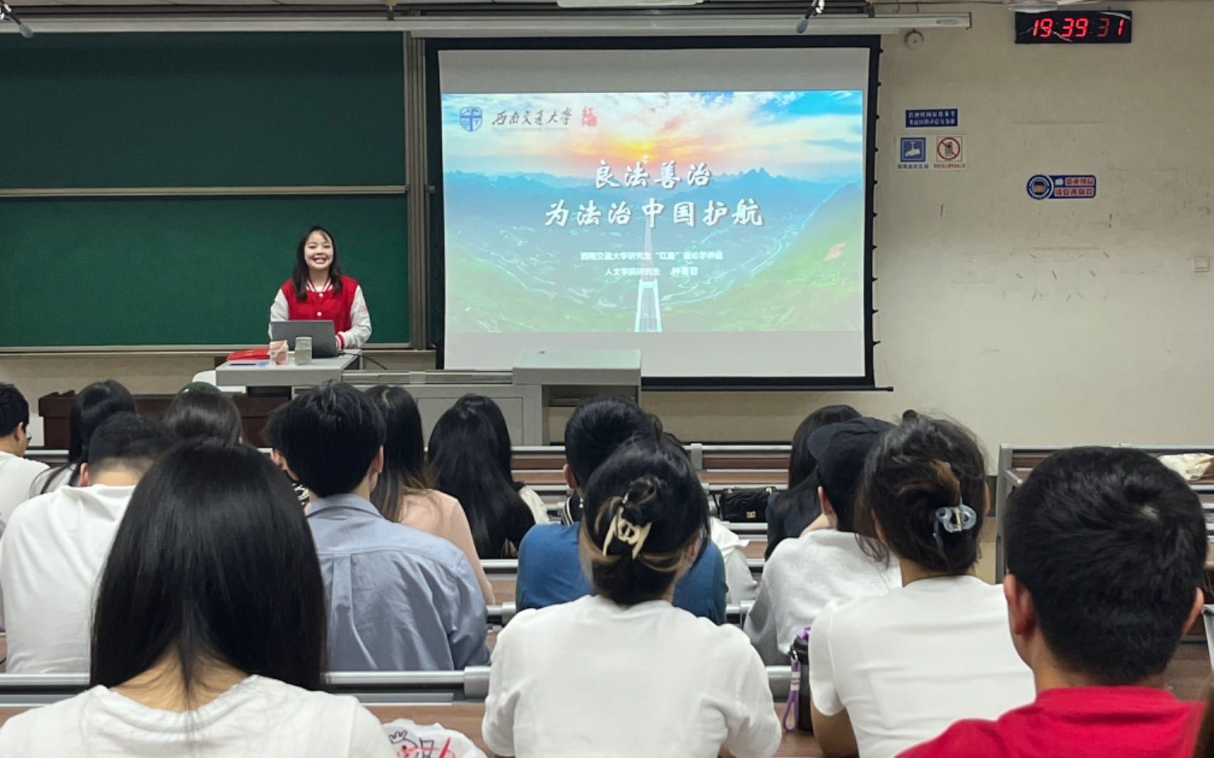 研究生党支部党纪学习教育主题党日活动暨 “崇德向善扬正气,严守纪律树新风”校级示范性学生党支部特色活动正式开始,并邀请研究生“红路”理论学讲团讲师钟蔓君同学作《良法善治,为法治中国护航》主题宣讲。法律是治国之重器,良法是善治之前提。钟蔓君用严肃又不失活泼的语言为大家详细描述了法治中国的基本内涵,同时又结合实际案例深入浅出地讲解了“良法”与“善治”的辩证关系。同学们也对自己理解中的“法制”与“法治”展开了热烈讨论。