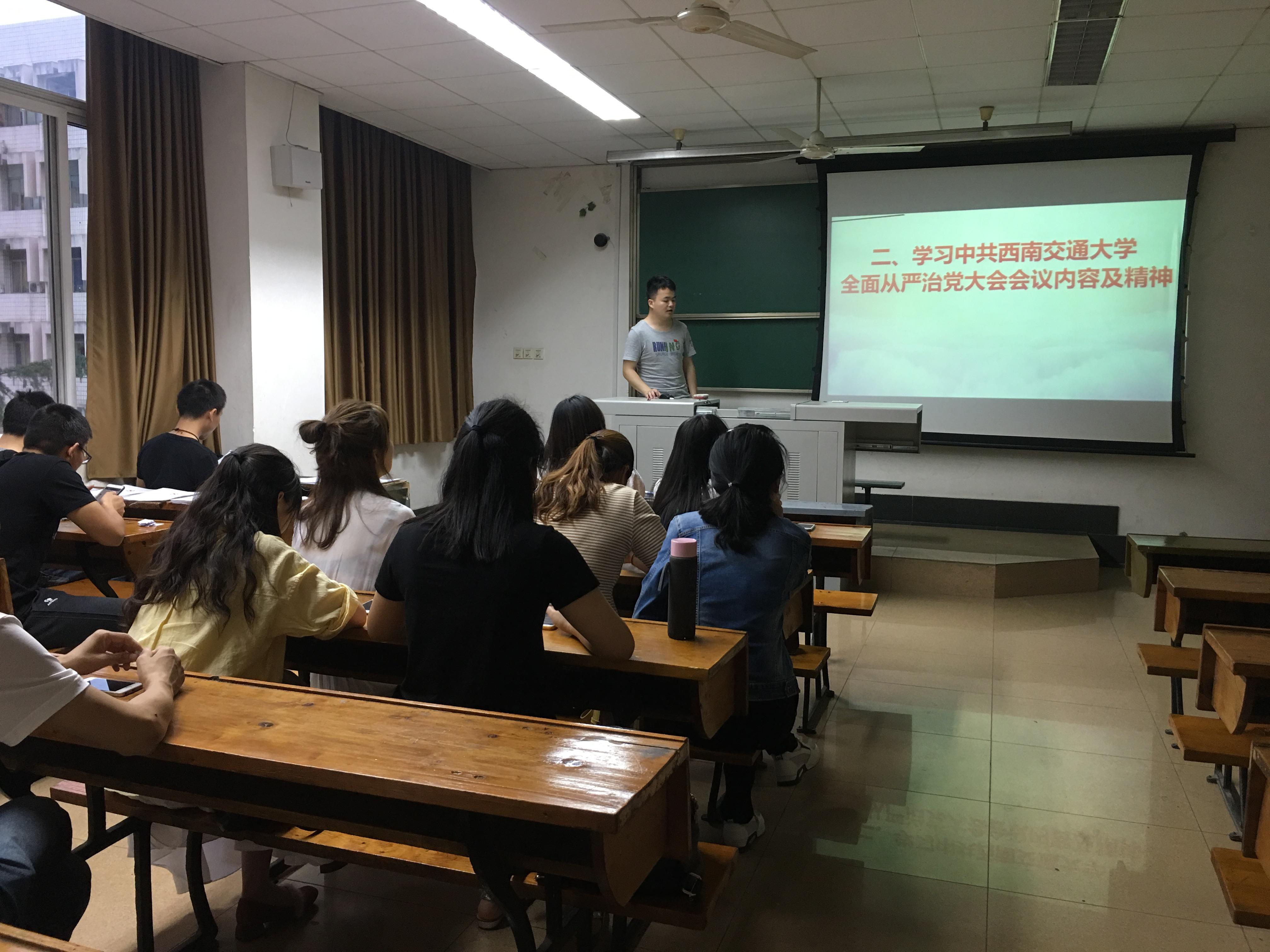 2016级硕士党支部于5月4日晚在4419教室召开组织生活会,专题学习中共西南交通大学委员会全面从严治党大会会议精神。会议由支部书记韦乐华主持,支部全体党员参加了学习。