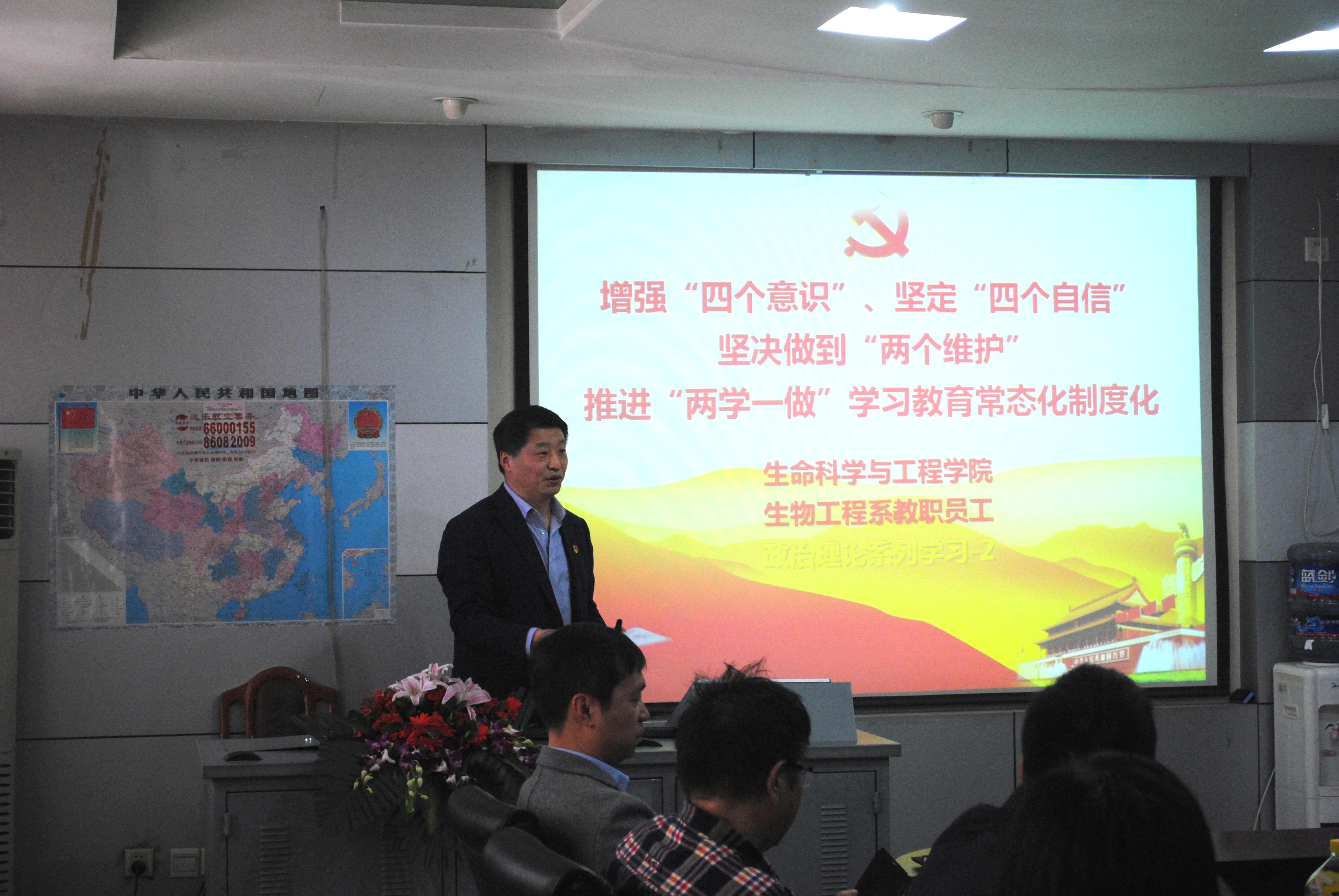 学院党委书记葛永明同志代表学院对冯晓云副校长的到来表示了热烈的欢迎,随后引导大家进行学院政治理论系列学习之二和学习活动,包括民主集中制原则和“四个服从”、党的“六大纪律”、对党员的五种纪律处分、反对“四风”、党面临的“四大考验”和“四大危险”、中国特色社会主义“五位一体”总体布局、“五大发展理念”、“四个全面”战略布局、“两个一百年”奋斗目标、社会主义核心价值观等内容。鼓励生物工程系老师们瞄准国家重点发展战略方向,积极主动对接川藏铁路的建设,在国家重大项目的建设中有所作为。