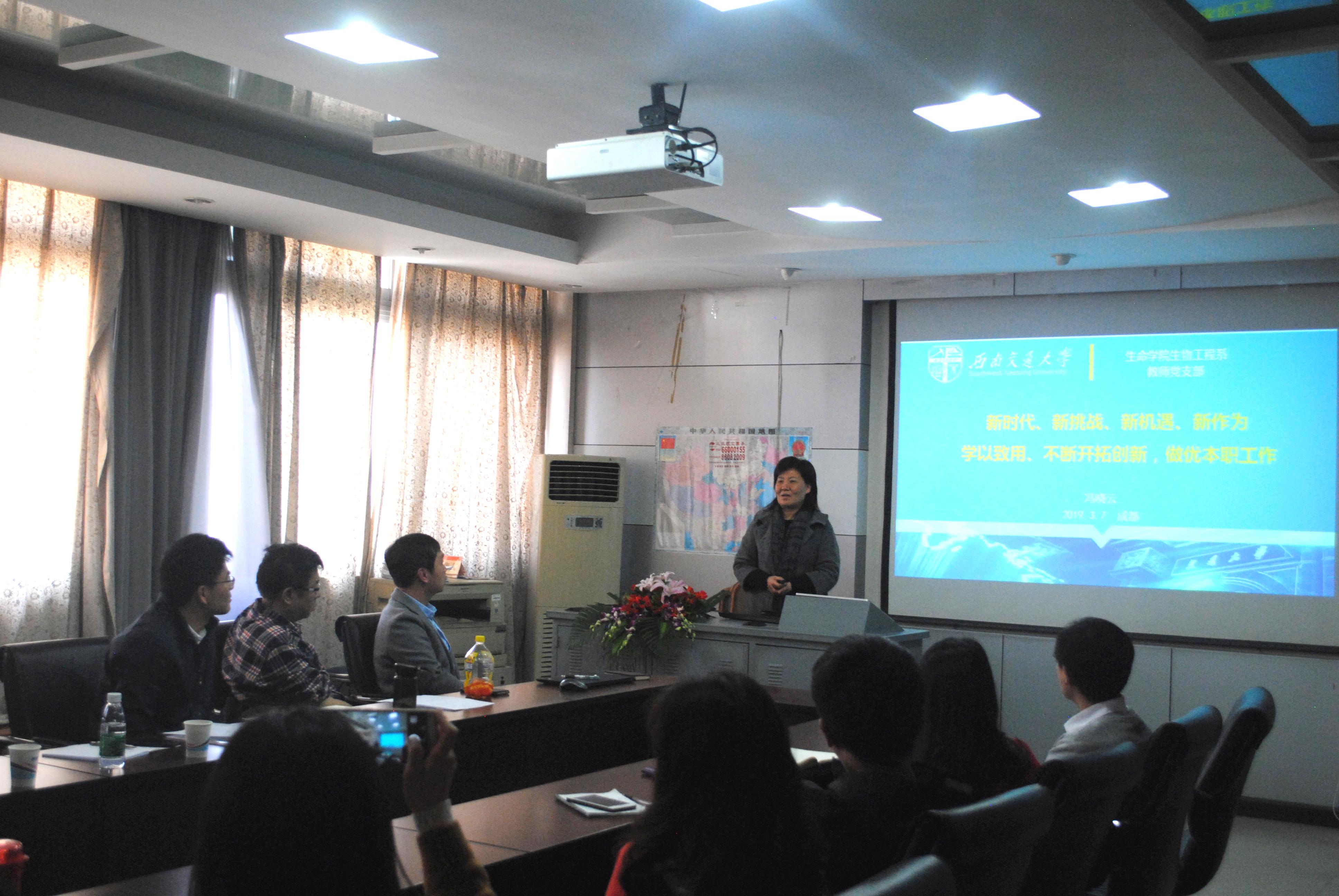 3月28日下午,生物工程系全体党员教职员工齐聚九里校区电气馆3609,开展习近平总书记在高校思政教师座谈会上讲话精神的集中学习,围绕“立德树人”全面推进生命板块人才培养工作进行研讨,冯晓云副校长来到学院参加了本次主题学习活动并作了重要讲话。新澳门六合彩资料