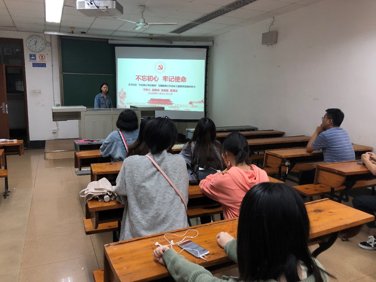 2018级硕士研究生党支部于9月4日晚在逸夫馆4304B教室联合开展了以“认真学习习近平总书记在“不忘初心、牢记使命”主题教育工作会议、中央政治局第十五次集体学习上发表的重要讲话精神”为主题的党日活动。活动由2018级党支部书记王珏同志主持,支部的党员和积极分子都参加了活动。