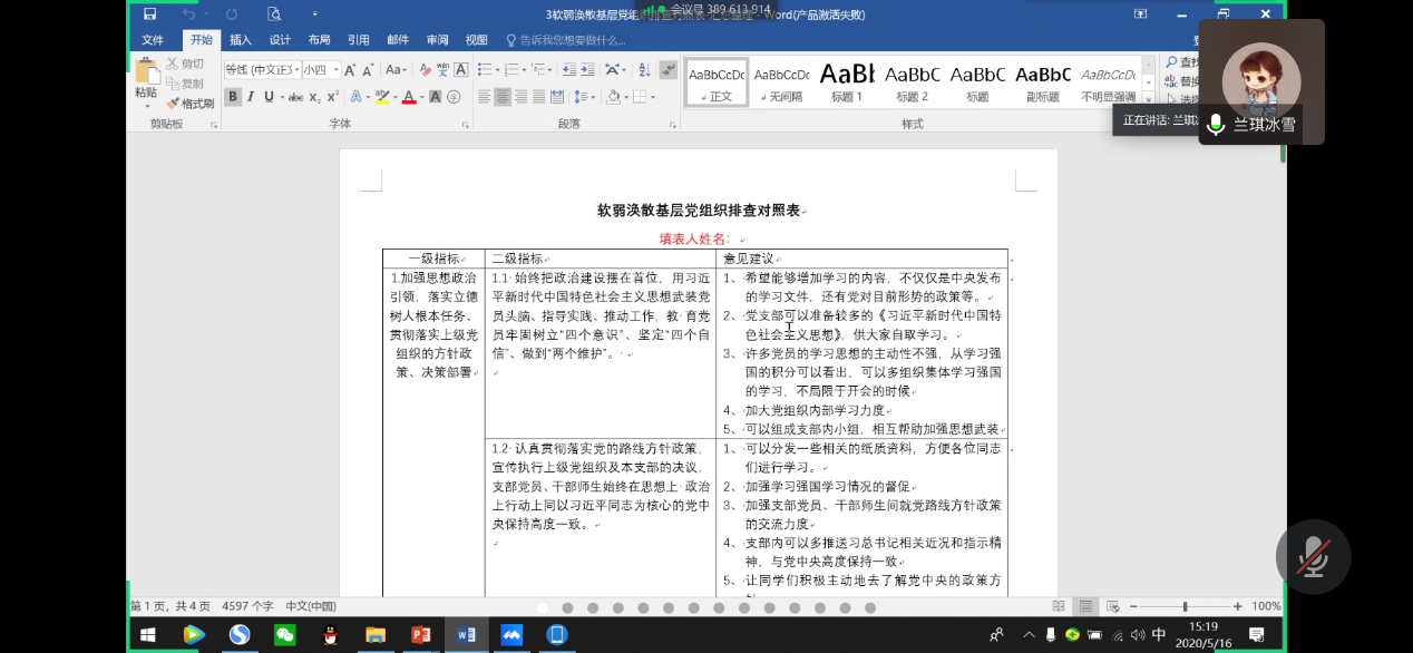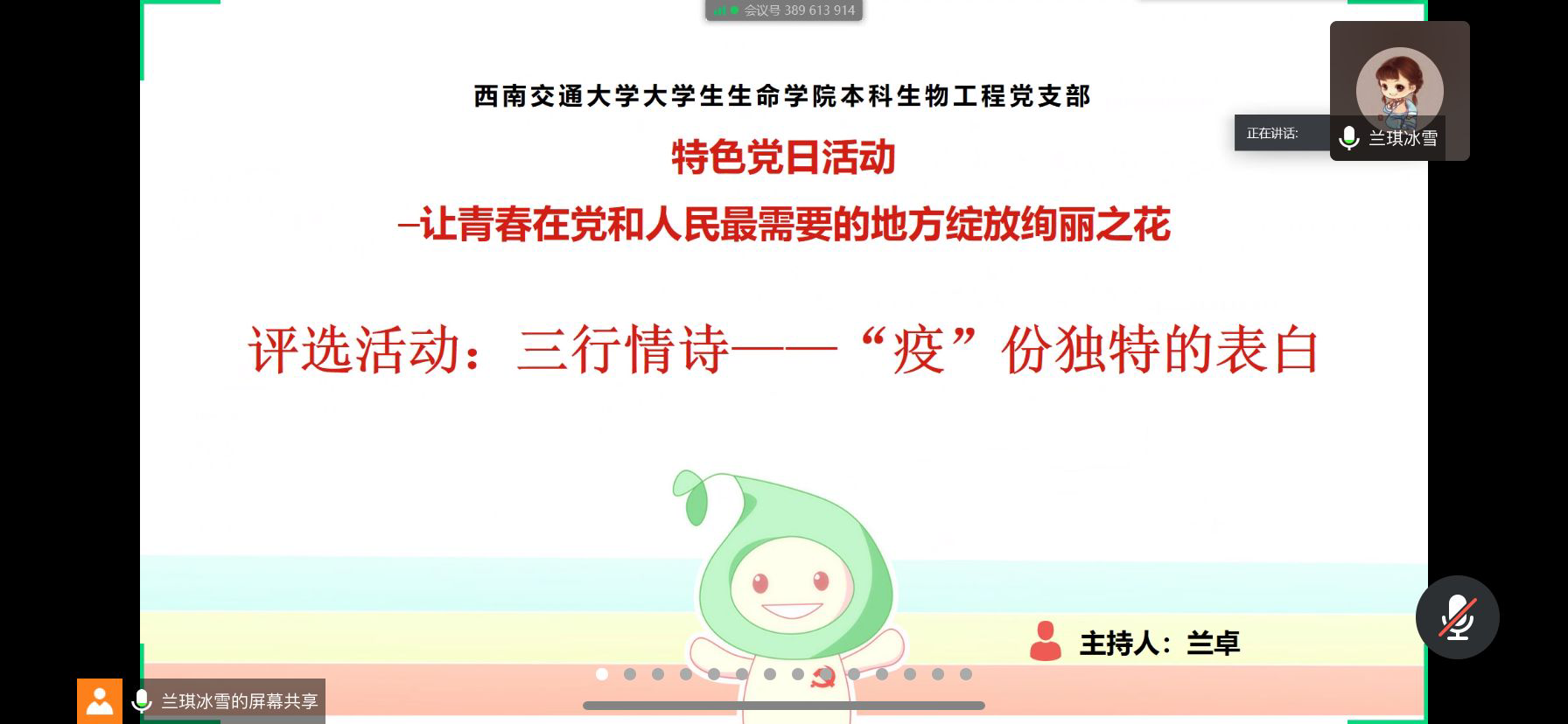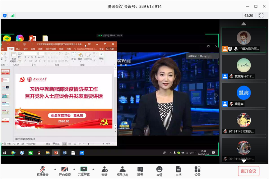本科生物工程党支部于2020年5月16日下午15时通过腾讯会议召开了以“让青春在党和人民最需要的地方绽放绚丽之花”主题的云党日活动,本次活动由党支部副书记兰卓主持,党支部全体成员参加。