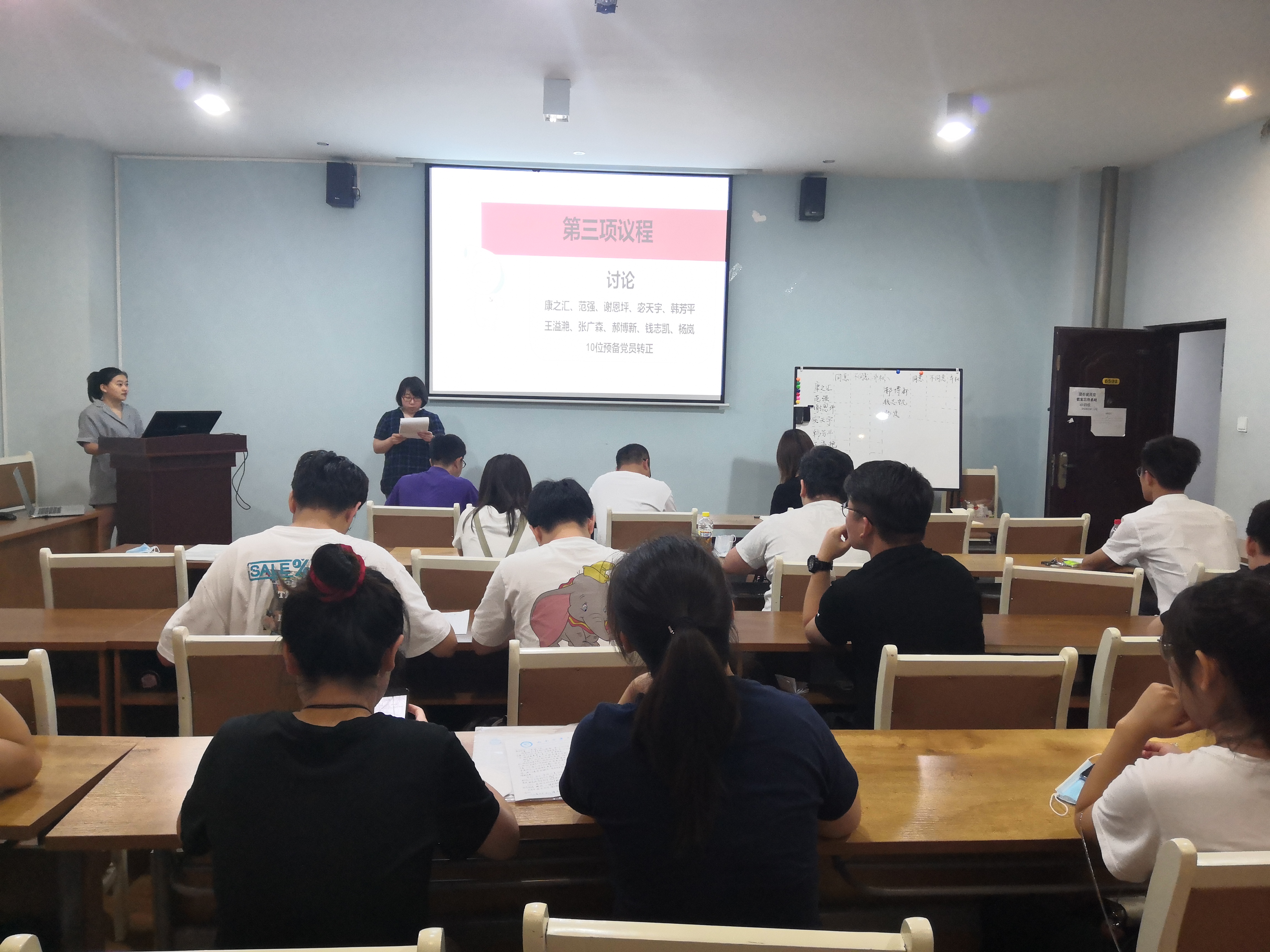 接下来,到场参加会议的正式党员对转正预备党员进行认真审议,严格按照转正预备党员的流程进行表决,康之汇等10名同志按期转正。
