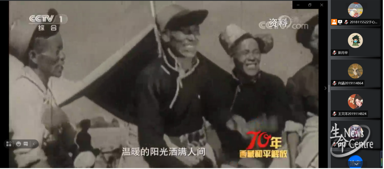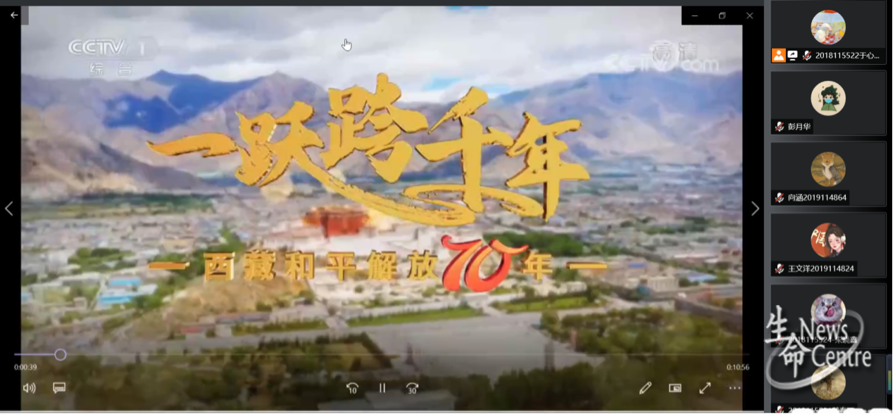 随后,于心怡同志带领大家观看了纪录片《一跃跨千年——西藏和平解放70年》,该片结合历史影像、典型故事,向我们生动讲述了西藏从和平解放以来发生的波澜壮阔的历史,呈现出一幅西藏“短短几十年、跨越上千年”的发展奇迹和各族群众幸福生活的美好画卷。以各个历史时期重大事件的亲历者、见证者、研究者等不同人群的亲身感受、故事和观察,反映70年来西藏发生波澜壮阔变化的深刻历史逻辑。以各领域从无到有、从有到强的发展历程,反映西藏人民70年来幸福指数是如何一步步提升的。