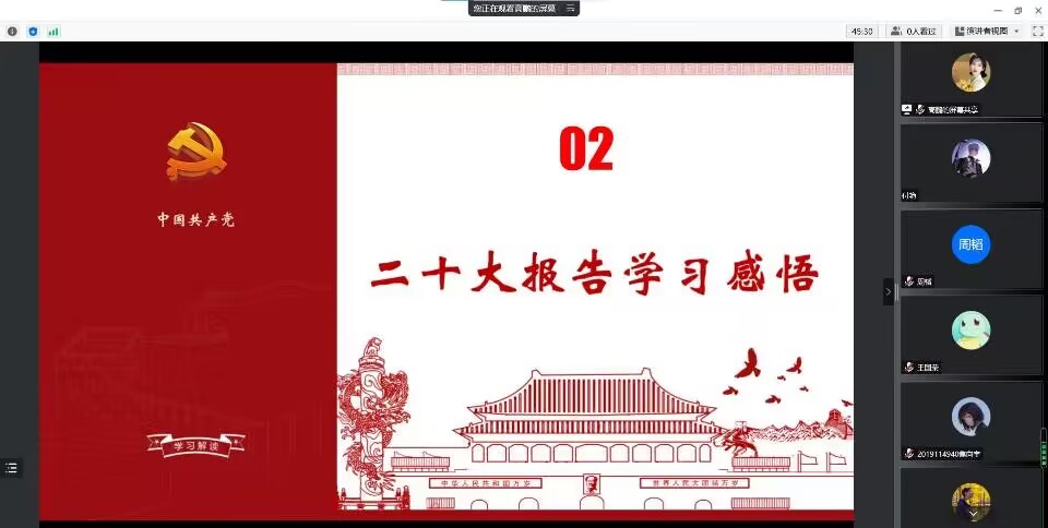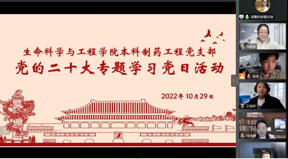 本科制药工程党支部采用腾讯会议的方式于线上开展二十大专题学习党日活动。本次党日活动由高鹏同志主持,本科制药工程党支部全体党员参加。
