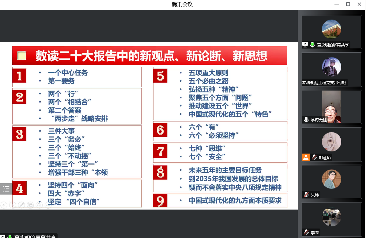 党委书记葛永明同志以“数读二十大报告关键词”为题,为学院两百余名师生党员专题讲授党的二十大精神。葛永明书记带领全体党员同志回顾党的二十大的大会主题,用9个数字来数读二十大报告中的新观点、新论断、新思想。