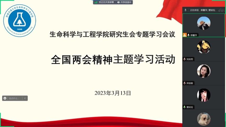 于2023年3月13日通过腾讯会议的方式开展主题教育学习活动。此次活动特邀学院青年讲师团成员、研究生会指导老师杨颖增老师为全体研会成员开展两会精神学习辅导。会议由研会文体部部长雷知钰主持,研究生会全体成员参加学习。
