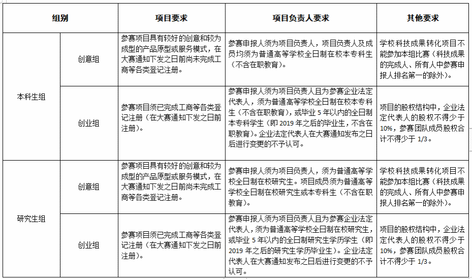根据参赛申报人所处学习阶段,项目分为本科生组、研究生组。根据项目发展阶段,本科生组和研究生组均内设创意组、创业组,并按照新工科、新医科、新农科、新文科、“人工智能+”设置参赛项目类型。