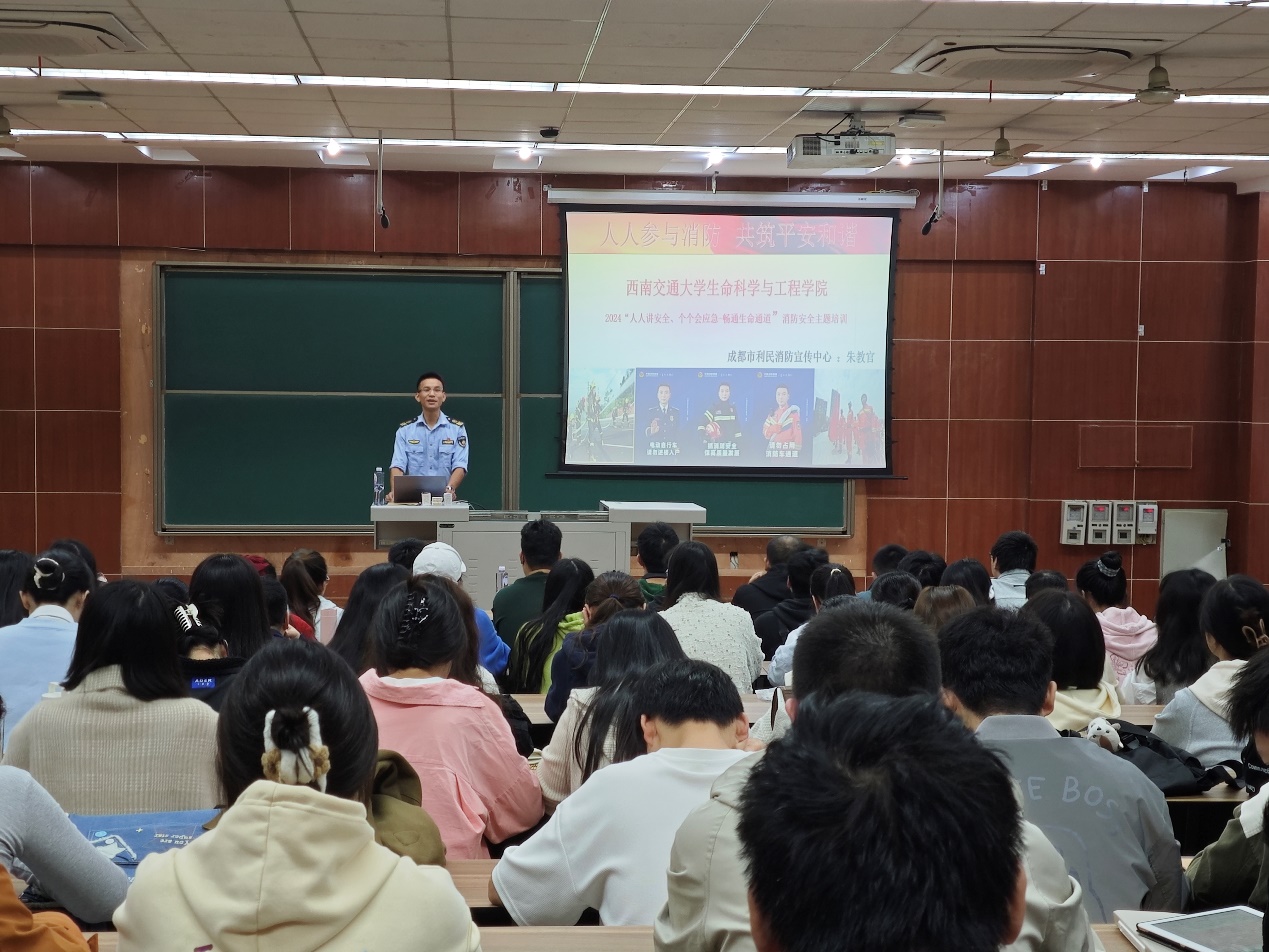院长助理王毅老师、成都市利民消防朱建教官、学院实验中心李云老师、研究生辅导员李麒麟老师及学院2024级硕士、博士全体研究生参加培训会。