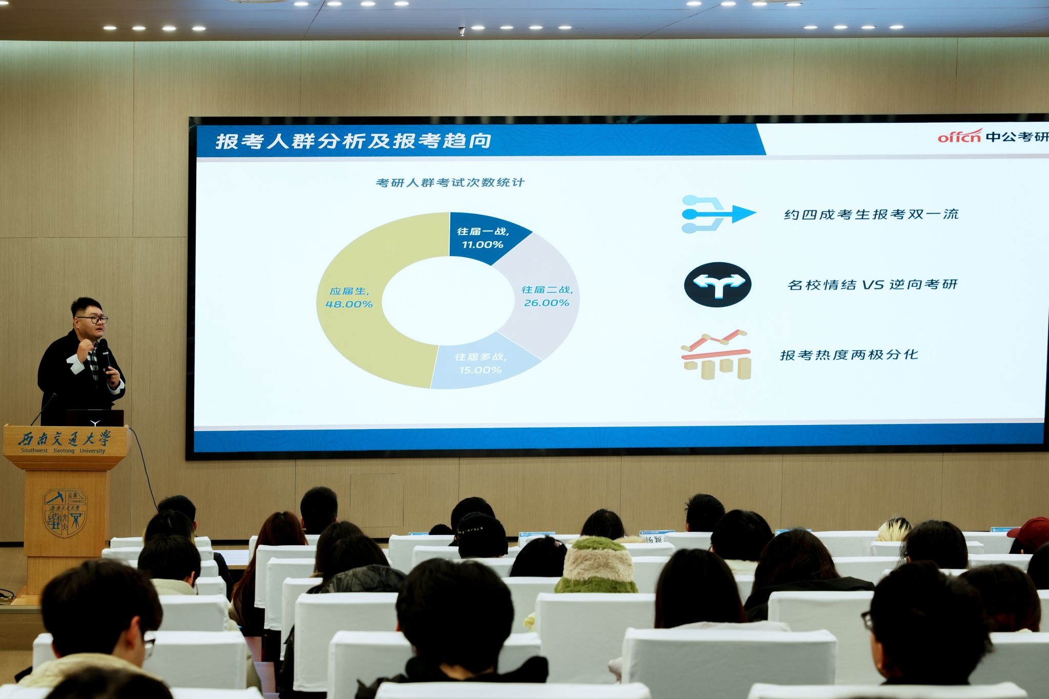 大会伊始,西南交通大学校外生涯导师、中公考研教研室主任梁萧老师作了关于考研与考公的主题分享。梁萧老师强调选择比努力更重要,同学们应根据兴趣和职业规划做出理性选择。他还建议同学们结合自身兴趣与未来发展趋势,制定切实可行的备考计划,保持积极心态,为实现目标做好充分准备。