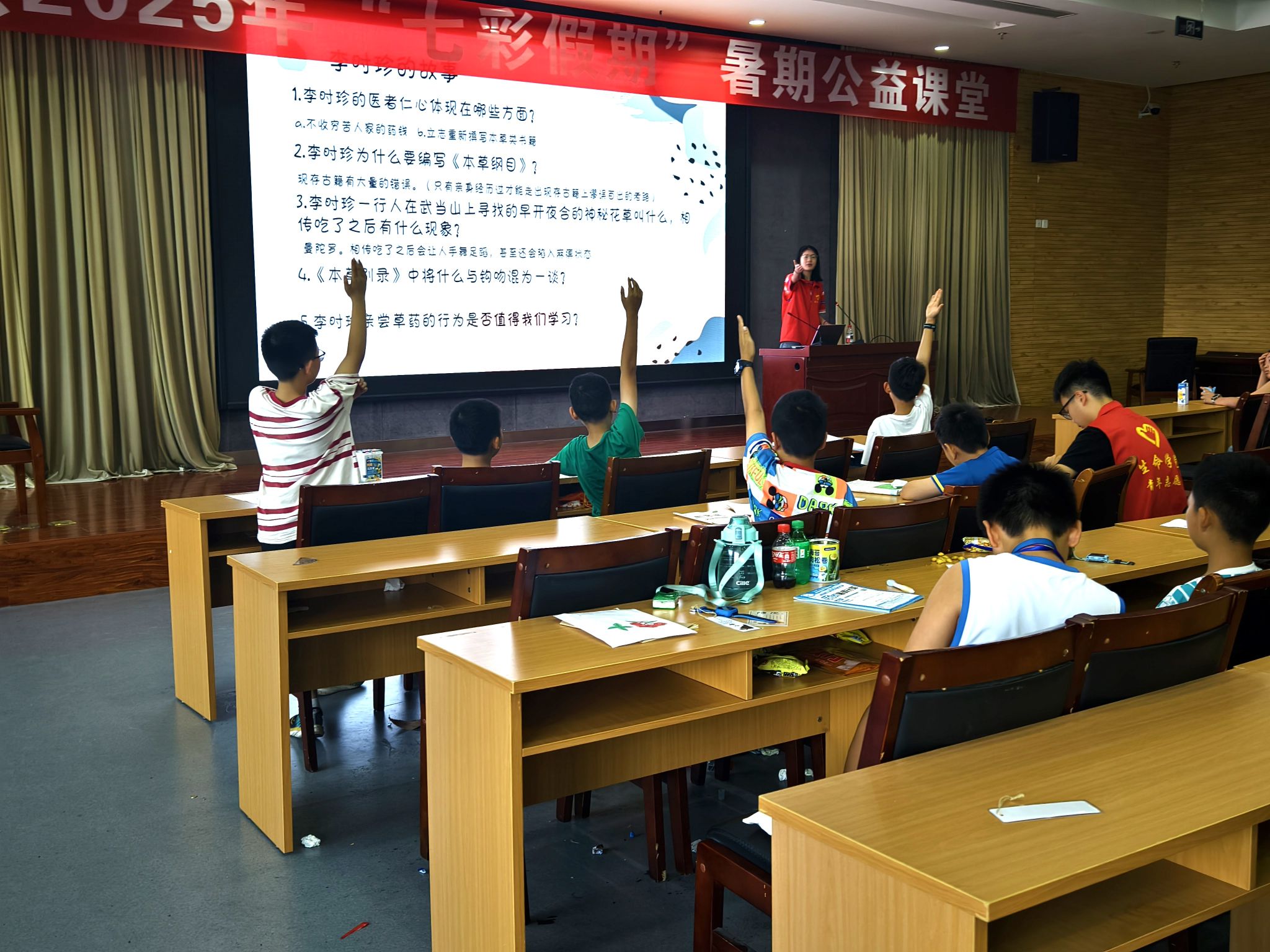 实践期间,团队志愿者联合资中县图书馆,为当地小朋友们精心打造了一堂妙趣横生的中医药文化课。志愿者用通俗语言讲解文化精髓,讲述李时珍编纂《本草纲目》的传奇,介绍菊花、蒲公英等常见药材的性味功效。课堂巧妙融入趣味问答、主题绘画、香囊制作等互动环节,让孩子们在动手实践中加深理解。课程尾声,志愿者带领大家体验24式简化太极拳的基本动作,引导孩子们亲身体验传统养生运动的魅力,完成了一次沉浸式的文化之旅。