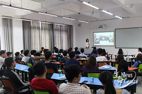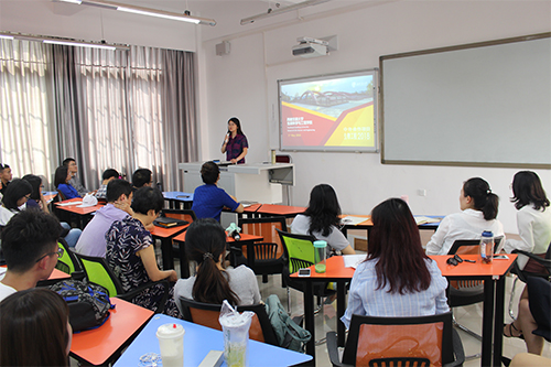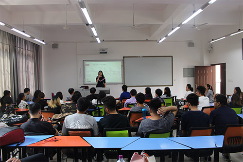 活动伊始,由2014级中美班李昶蓥向2016级、2017级中美班同学细致地介绍了在乔治亚州立大学(下文称GSU)的学习和生活经历,包括GSU的校园文化、课程设置、学习模式、交通住宿等。她向学弟学妹们提出以下建议:一是在国内打好语言基础,除了可以争取奖学金,还可以更好地融入美国课堂环境;二是在选课方面要量力而行,美国的学校要求每学期至少修够12学分,每门课要求十分严格,如果得到“F”会影响成绩单,所以大家一定要合理安排自己的课表,认真预习、复习,完成课业任务;三是提早做好毕业后的去向选择。如果想申请国外大学,就必须在毕业的前一年12月之前准备好所有申请材料,这要求同学们之前必须计划好如何修读每一门课,出色的表现可以争取到老师推荐信,从而争取到更好的学校继续深造;四是建议同学们在美国要相互照应,异乡的生活对同学们生活自理能力要求很高,大家在一起生活可以降低生活成本。