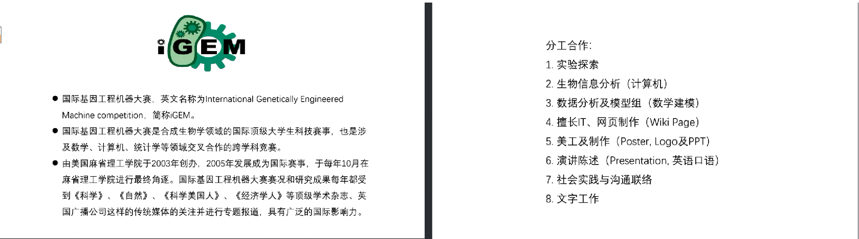 分享环节之后,李响向同学们进行了生命科学相关竞赛的科普。她主要向同学们介绍了iGEM,即国际基因机器工程大赛。iGEM是一项多学科融合的国际性赛事,激发了同学们对生命科学的求知欲望,获得了同学们的广泛关注。