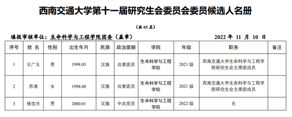根据校团委《关于做好西南交通大学第十一次研究生代表大会筹备工作的补充通知》要求,在征求学院研究生会意见后,经班级团组织推荐,由学院团组织考察,现将新澳门六合彩资料 参加西南交通大学第十一次研究生代表大会代表名单及西南交通大学第十一届研究生委员会委员候选人名单公示(见附件)。推举结果公示如下