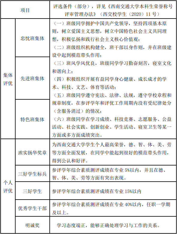 按照《西南交通大学本科生荣誉称号评审管理办法》相关规定,为了树立典型,表彰先进,培育优良班风学风,促进学生德智体美劳全面发展,学校决定在2022年9月-11月期间组织开展2021-2022学年本科生荣誉称号评选工作。