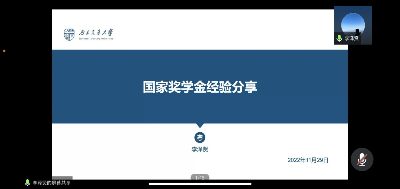 研究生朋辈优秀经验分享交流会于线上顺利举行。学院邀请了2022年博士国家奖学金获得者李泽贤,2022年硕士国家奖学金获得者、研究生竢实扬华奖章获得者谭力川,2022年研究生忠忱班集体获奖班级-2020级硕士3班团支书李建鹏,为大家带来优秀经验分享交流会。研究生辅导员兰卓主持会议,学院2022级硕士、2021级硕士200余人参加本次分享交流。