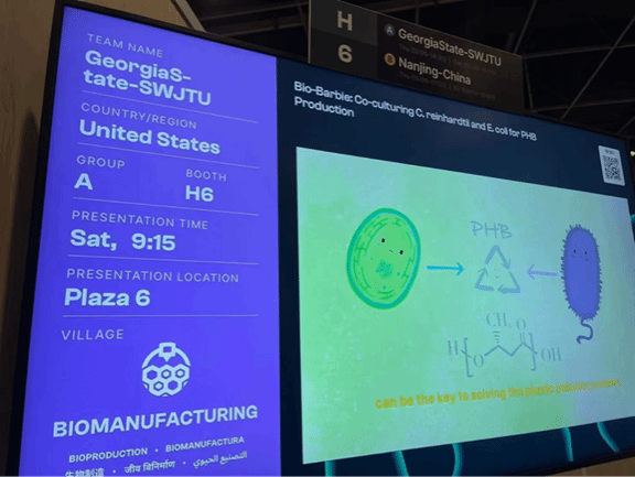 今年GeorgiaState-SWJTU团队由30位来自西南交通大学和乔治亚州立大学的同学组成,以“Bio-Barbie: Co-culturing of C.reinhardtii and E.coli for PHB Production”为题,构建了基于大肠杆菌和莱茵衣藻共培养体系的可降解塑料聚羟基丁酸酯(Polyhydroxybutyrate, PHB)的自产系统,研究PHB为全球塑料分解问题带来的新思路。