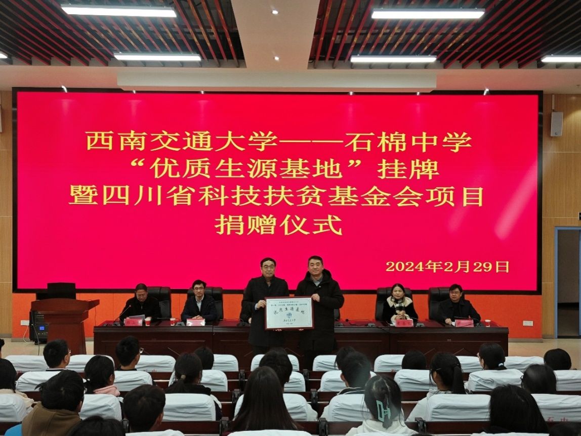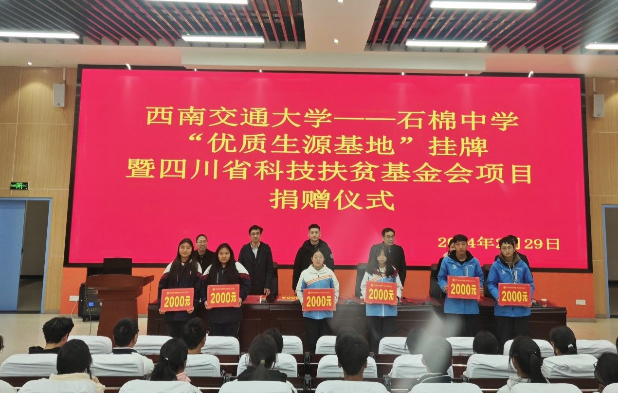 当天下午,在石棉中学举行了西南交通大学-石棉中学“优质生源基地”挂牌暨四川省科技扶贫基金会项目捐赠仪式。西南交通大学招生就业处处长陈岩峰,新澳门六合彩资料