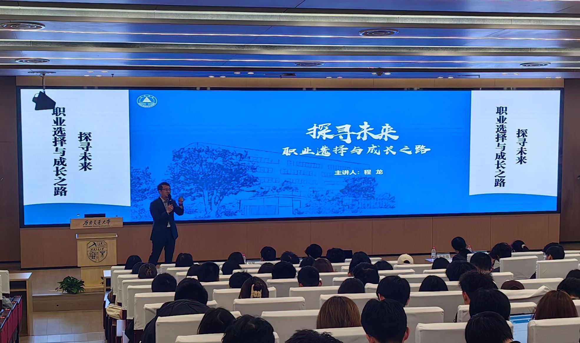 邀请优秀校友程龙先生做客学校思政精品项目活动“学思讲坛”,以《探寻未来---职业选择与成长之路》为题开展职业生涯规划讲座。本次活动由学院学生工作组、院团委、学生会、“学思”辅导员工作室承办。学院党委书记黄春蓉、党委副书记朱炜、学生工作组辅导员老师以及300余名同学参加了本次活动。