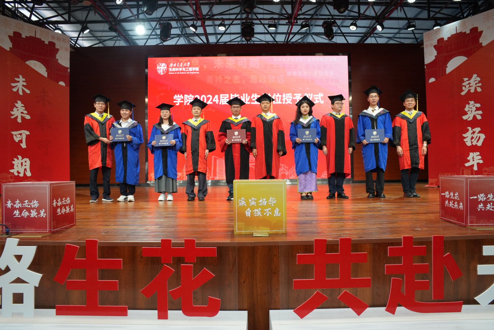 在典礼上,学院学位分委会周先礼教授、高峰教授、茆灿泉教授、黄新河副教授、廖海副教授、封顺教授、陈琳副教授、万军副教授为2024届毕业生逐一拨穗授位。