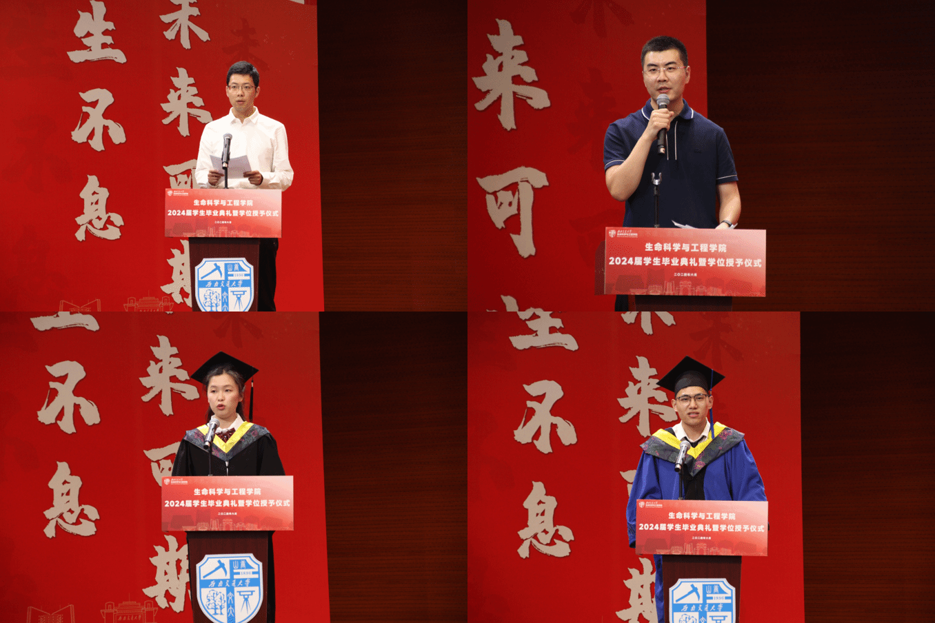 在典礼上,王宁宇副教授作为教师代表发言,他结合自己的求学经历和人生经验,表达了对同学们的殷切期望和美好祝愿,希望同学们脚踏实地,砥砺前行,永远保持对学习的热情,用自身所学服务社会。学院2017届本科毕业生、科伦药业江西省区总经理杜隆飞作为校友代表发言,他分享了自己投身生物医药行业发展的成长经历,鼓励同学们带着知识经验教训去拼搏,尽情发挥自己的才能,活出自己的精彩人生。研究生生物与医药专业周俊达同学、本科制药工程专业张阿凤同学分别作为毕业生代表发言,他们分享了自己大学的收获,表达了对母校、领导老师们的感激,对未来的期待与憧憬,表示要将爱国、爱校之情转化为强国之志、报国之行,以实际行动践行新时代交大生命人的责任与担当。